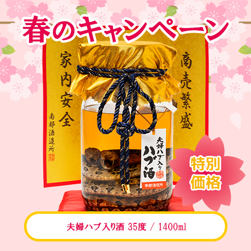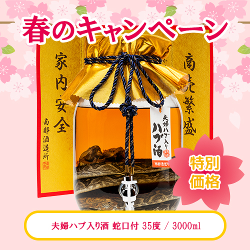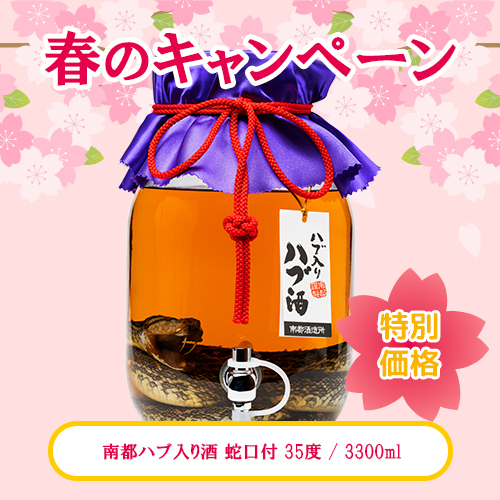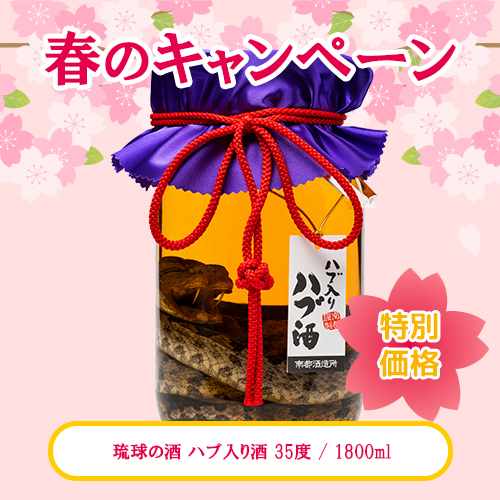 春のキャンペーンにふさわしい、ハブ入りハブ酒が期間中だけの特別価格!